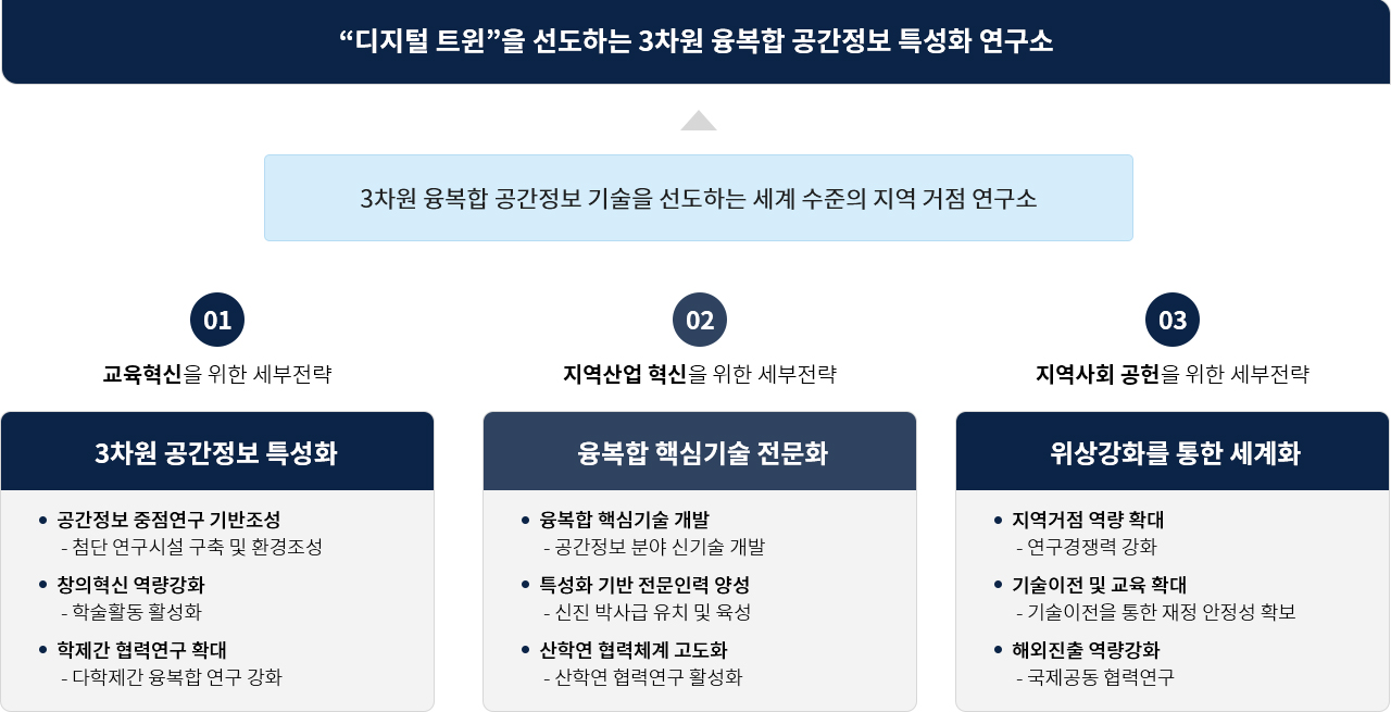 스마트도시공간연구소는 학제간 융‧복합 연구를 통하여 국토‧지역‧도시의 기술경쟁력을 강화하며, 기초 및 응용에 관한 연구를 수행함으로써 융복합 공간정보 관련분야의 발전에 기여함을 목적으로 하고 있습니다.